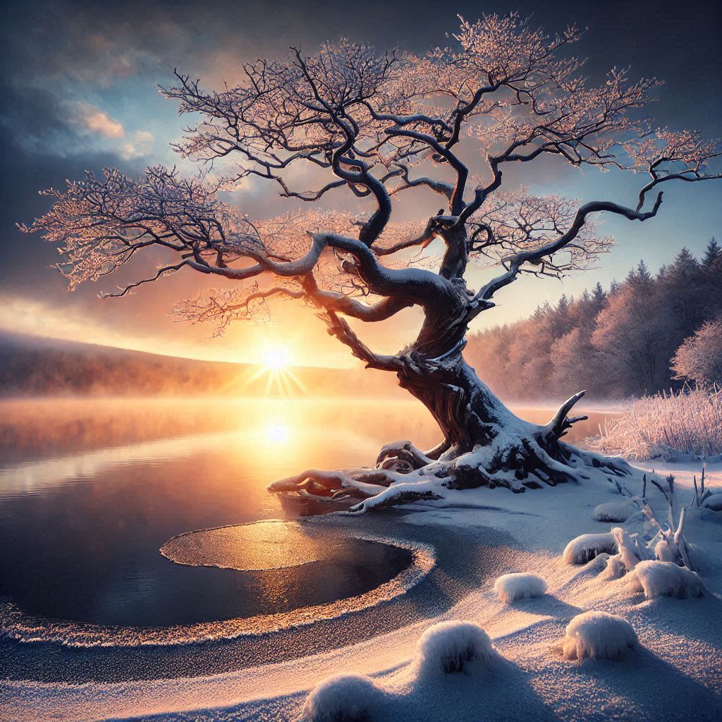 Kako je sunce izlazilo, sneg se počeo blistati u zlatnom sjaju, stvarajući prizor koji oduzima dah. Jezero je reflektovalo te tople boje, dok su se pahulje snega topile na njegovoj površini, stvarajući mekane zvuke.U samom srcu šume, najstarije drvo je stajalo kao čuvar ovog zimskog pejzaža. Njegove grane, prekrivene snegom i ledom, šuštale su na vetru, dok je koren duboko bio usađen u zamrznutu zemlju. Drvo je bilo simbol izdržljivosti i snage, preživljavajući mnoge zime i čuvajući uspomene na sve godišnje dobe koja su prošla.