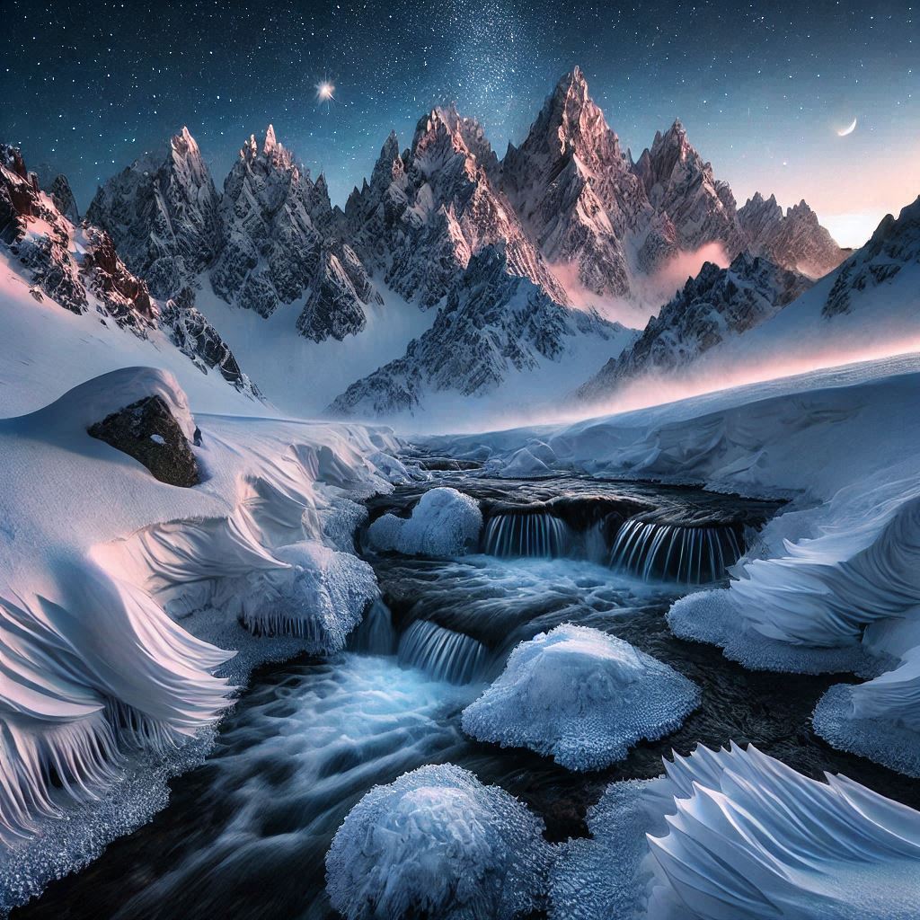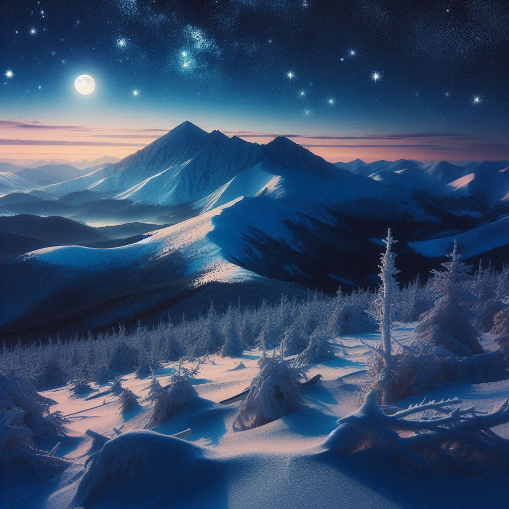 Planinski vrhovi na horizontu bili su prekriveni večitim snegom, izgubljeni u magli koja je polako puzala niz padine. Zvuk pucketanja leda i povremenog lomljenja grana stvarao je simfoniju prirode, dok je zima plela svoje čarolije širom predela.Kako se noć spuštala, svetlucanje zvezda osvetljavalo je sneg, stvarajući iluziju hiljada sitnih bisera razasutih po zemlji. Mesec, velik i blještav, nadgledao je ovaj tihi svet, dok su noćni zvuci prirode pružali osećaj mira i večnosti.